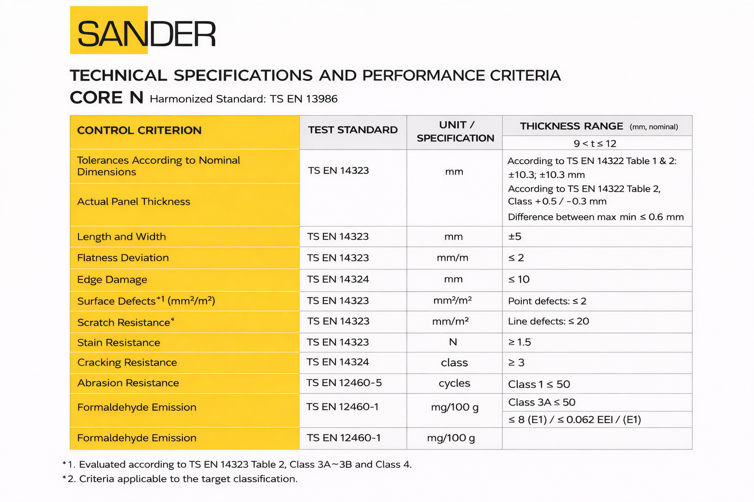 During this technical assessment, thickness and tolerance values were defined to ensure long-term stability in humid interiors, while surface properties were determined to provide resistance against cleaning chemicals, scratching, and staining. Formaldehyde emission values were kept within safe limits for indoor environments.